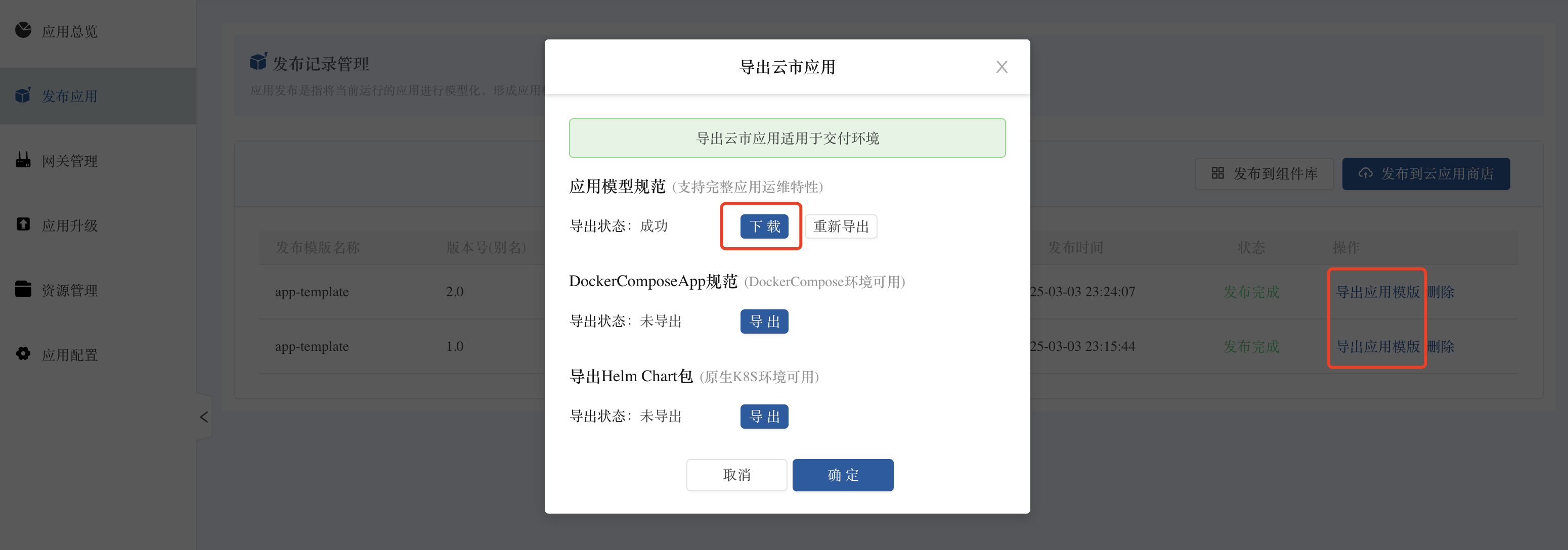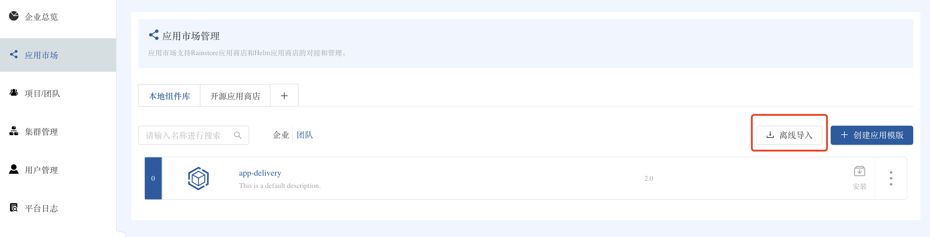 使用教程离线跨环境交付本页总览离线跨环境交付本教程将演示 Rainbond 离线交付的部分核心能力: 离线应用打包:将应用模板及其依赖资源打包,支持完全离线环境部署。 跨环境交付:实现从开发到测试、生产环境的标准化交付流程。 一键部署验证:在目标环境快速部署并验证应用功能。 前提 准备两套独立环境(标记为环境A/B) 均已完成 Rainbond 快速安装。 一、生成离线包(环境A) 🚀 亮点