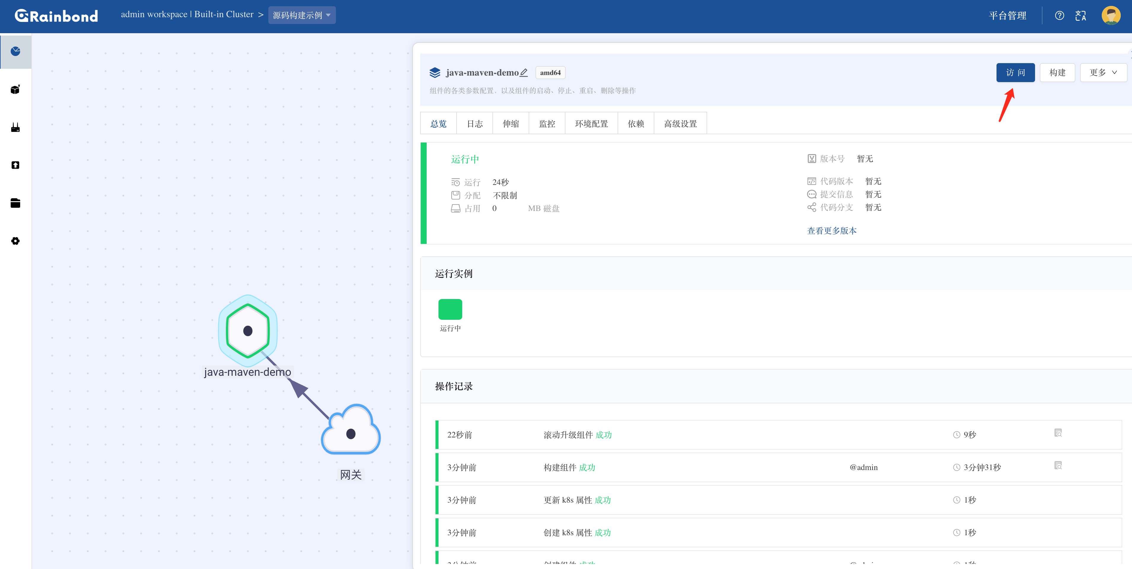 使用教程快速部署源码和 MySQL本页总览快速部署源码和 MySQL本教程将演示 Rainbond 的部分核心能力: 源码构建:自动识别 Java Maven 语言,完成从源码到运行的自动化部署。 应用市场生态:一键安装标准化中间件,实现生产级可用性。 组件的拼装:可视化建立服务依赖,自动注入环境变量与连接信息。 前提 已完成 Rainbond 快速安装。 一、通过源代码部署 Java Maven 服务